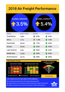 The International Air Transport Association (IATA) released full-year 2018 data for global air freight markets showing that demand, measured in freight tonne kilometers (FTKs) grew by 3.5% compared to 2017. This was significantly lower than the extraordinary 9.7% growth recorded in 2017.